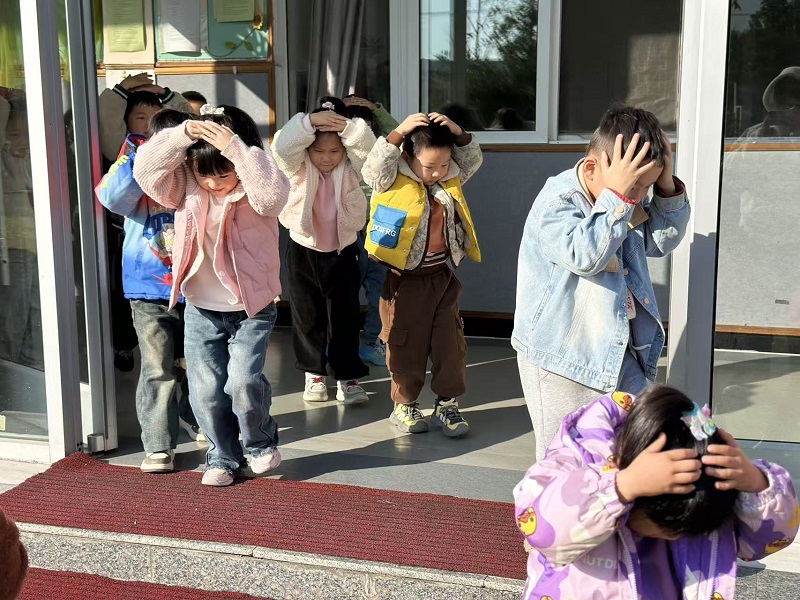 随着警报声响起,老师们立即组织幼儿排成小队,双手抱头,弯腰快速、有序地沿着预定疏散路线快速撤离到空旷操场。整个过程紧张有序,用时2分15秒完成全员疏散。